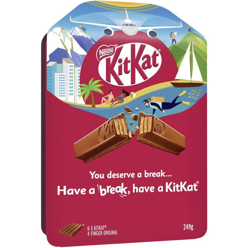 Wherever your travels take you, take home a piece of your adventure with the NESTLE KITKAT 4F Travel Gift Box. This eye-catching gift box contains six 4 Finger KITKAT bars, the perfect gift to share with friends and family back home. Four fingers of crispy wafer with a perfectly satisfying crunch in every bite, covered in deliciously smooth milk chocolate. Open, break, snap and enjoy - together. KITKAT supports improving the lives of cocoa farmers and the quality of cocoa through the NESTLE COCOA PLAN and by working with the Rainforest Alliance. Exclusive to travel retail.