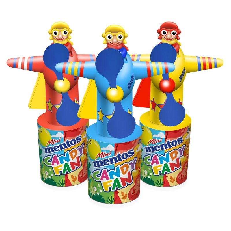 Contiene 4x Mentos Mini Rolls de sabores Cola, Naranja, Limón y Fresa. Disponibles en rojo, amarillo y azul. Con empuñadura para hacer girar el abanico.