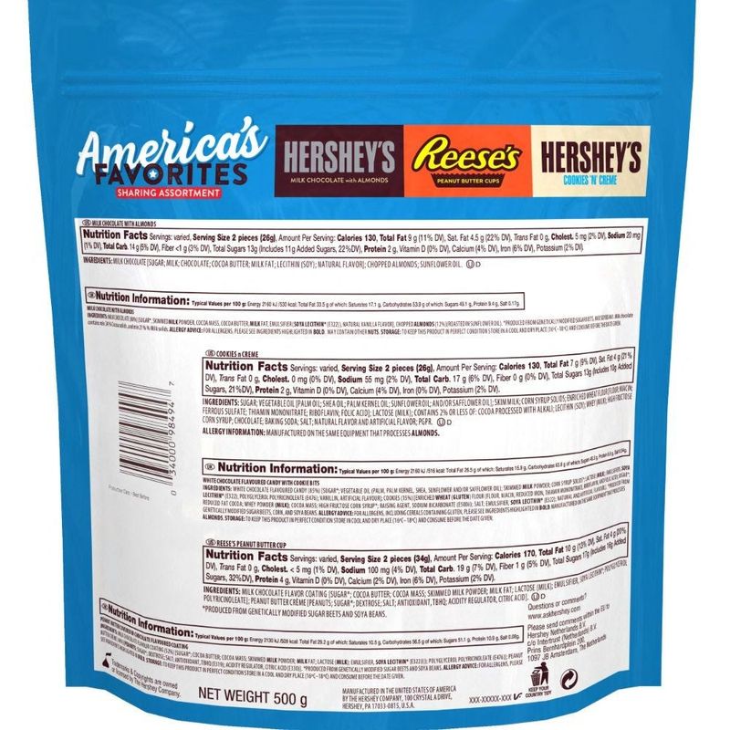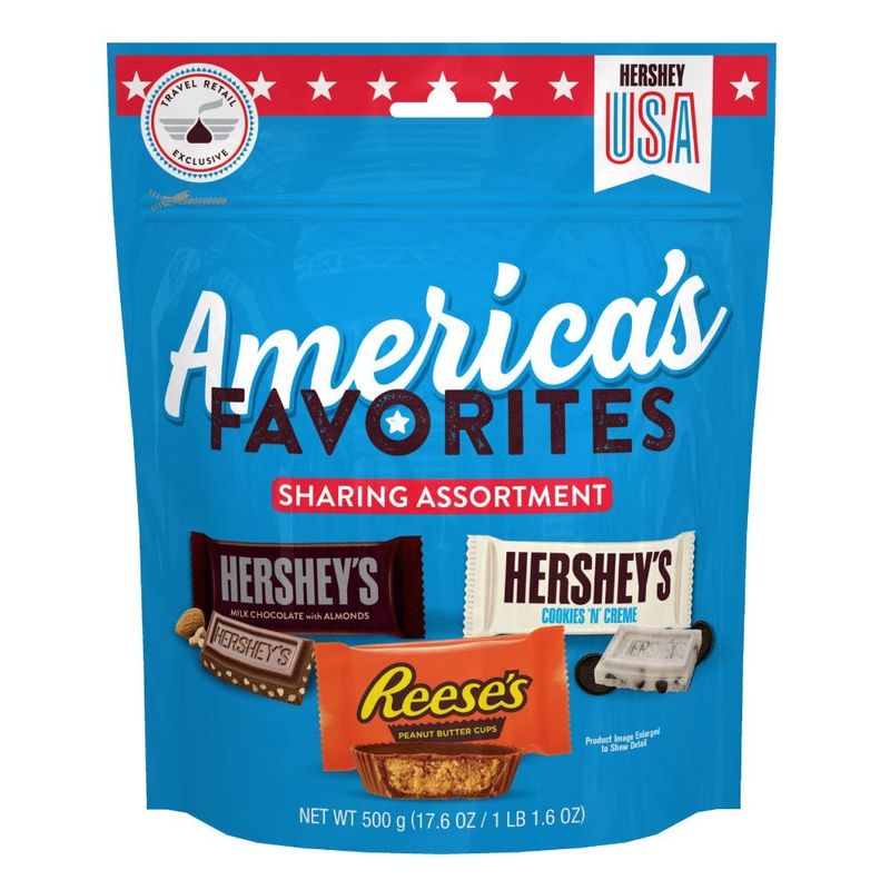 ¡Este surtido HERSHEY America's Favorites Snack Size trae todos tus sabores favoritos en una bolsa! El surtido incluye HERSHEY'S Cookies 'N' Crème, HERSHEY'S Milk Chocolate with Almond y REESE'S Peanut Butter Cups en el tamaño perfecto para compartir: ¡tamaño snack! Envueltos individualmente. Un surtido de bombones kosher. Esta es una exclusiva de Travel Retail.