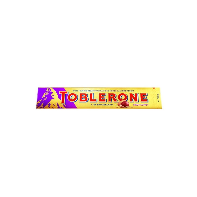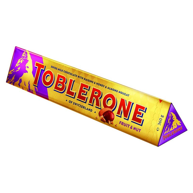 Disfrute de TOBLERONE Fruit & Nut, el icónico chocolate triangular de Suiza con turrón de miel y almendras combinado con suaves y dulces pasas, ¡para un capricho divertido y afrutado! Este paquete dorado-violeta exclusivo para viajes contiene 360 g de TOBLERONE Fruit & Nut: ¡un regalo perfecto para cualquiera que se sienta afrutado! Fabricado en Suiza.