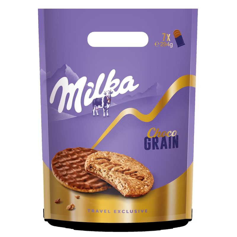 Milka Chocograins Pouch is filled with crunchy oat biscuits covered with the favorite alpine milk chocolate