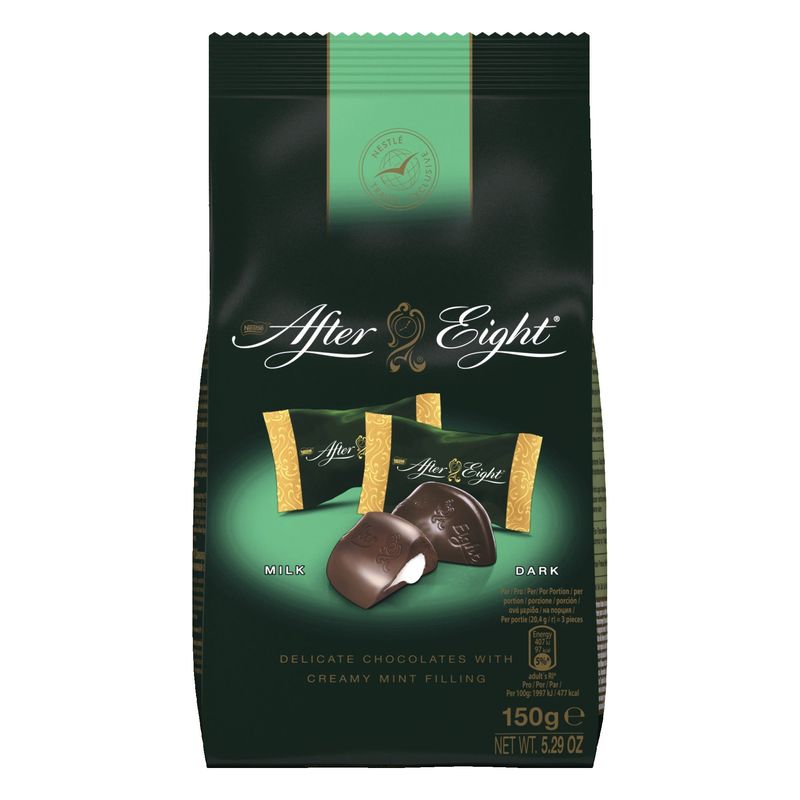 After Eight Snacking Bag, el compañero de viaje ideal. Mejore su viaje con una selección de los deliciosos pralinés de menta favoritos de todos: un refrescante centro de fondant de menta recubierto de rico chocolate con leche o negro. Ya sea para picar durante el viaje o para saborear en casa, comparta la elegancia de After Eight en una práctica bolsa con aprox. 22 unidades. cacao en grano 100% sostenible certificado obtenido a través del PLAN DE CACAO DE NESTLE. Exclusivo para travel retail.