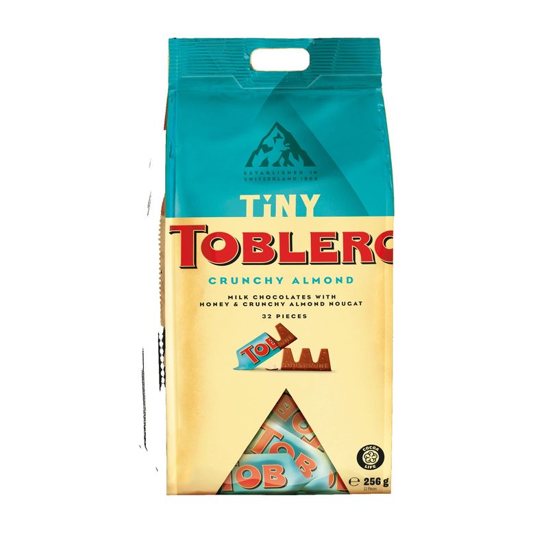TOBLERONE Tiny Crunchy Almonds, uno de los sabores de más éxito, ¡ahora disponible en un nuevo formato! El icónico chocolate con leche triangular con miel y turrón de almendras enriquecido con crujientes almendras caramelizadas y una gota de sal se ofrece en una brillante y exclusiva bolsa de viaje azul y dorada de 34 piezas tamaño snack envueltas individualmente. Perfecto para compartir con los suyos.