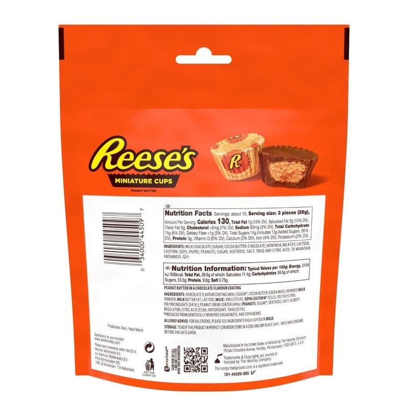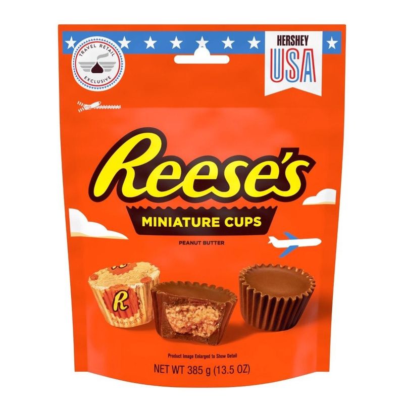 Incluso en miniatura, estos pastelitos de mantequilla de cacahuete tienen un gran sabor a chocolate con leche Las miniaturas de REESE'S Peanut Butter Cups son la combinación perfecta de salado, dulce y sin gluten. Coge un puñado para picar algo sobre la marcha o para compartir con los amigos... suponiendo que puedas dejar escapar estas deliciosas golosinas. Envueltos individualmente en llamativas láminas doradas. Un caramelo kosher y sin gluten. Exclusivo para Travel Retail.