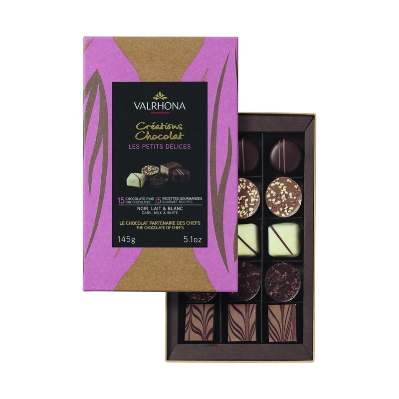 Una selección gourmet de 15 bombones finos inspirados en la repostería francesa: Milhojas, Crème caramel, Fondant au chocolat, Succès praliné, Paris-Bres