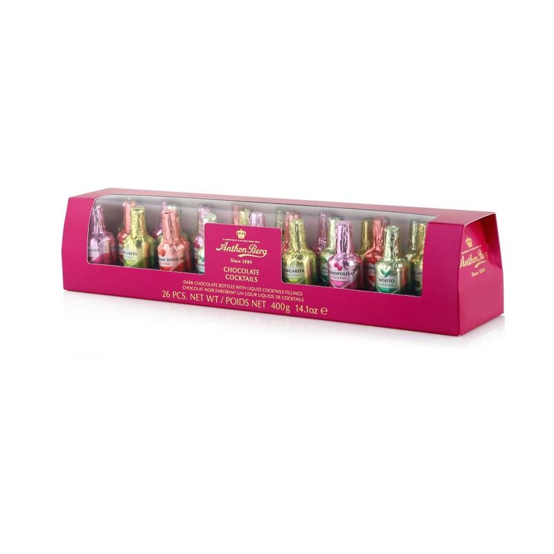 Una caja de botellas de chocolate negro Anthon Berg con rellenos de cócteles liuidos. Prepárese para una delicia de chocolate con nuestros cócteles de chocolate que contienen suaves rellenos líquidos con el auténtico sabor de algunos de los cócteles más apreciados a escala mundial. Nuestros chocolateros los mezclan y agitan inspirándose en los cocteleros. Perfectos para compartir en ocasiones festivas.
