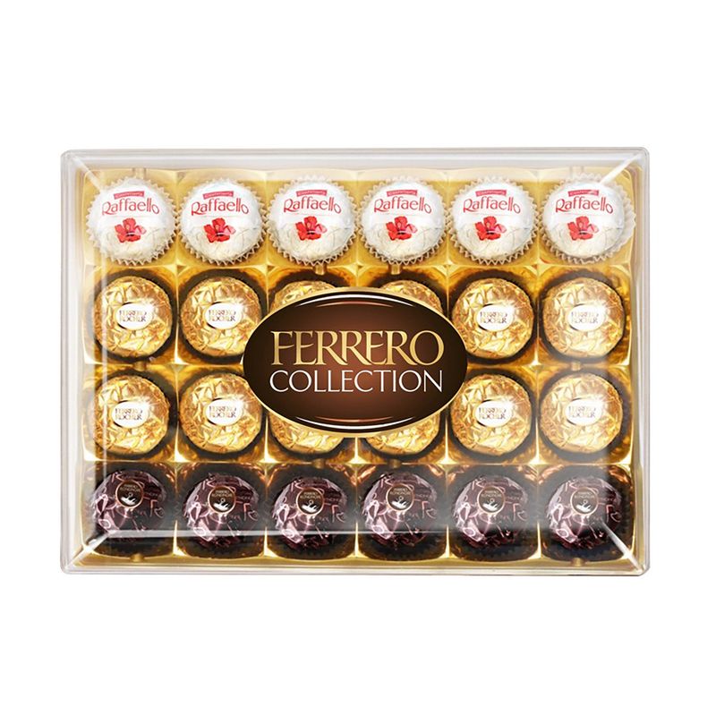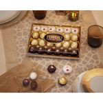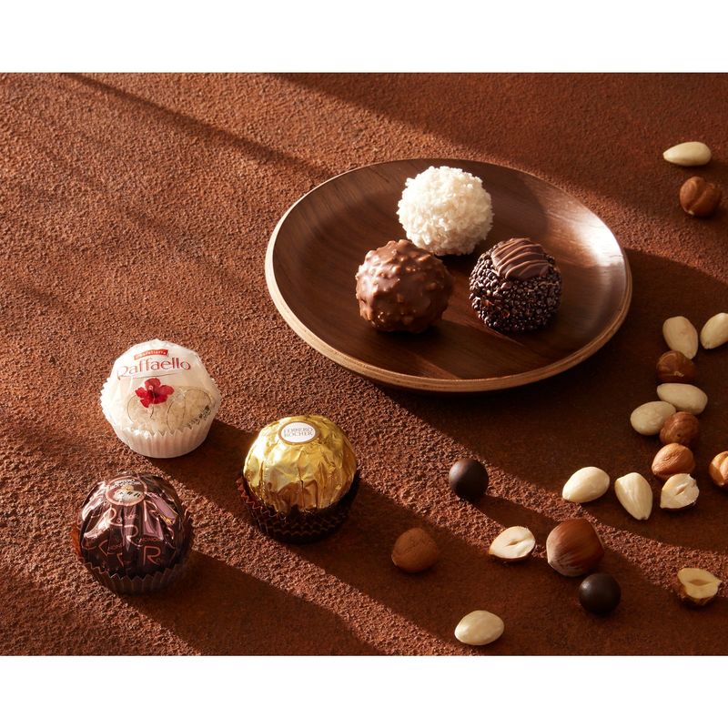 Surtido clásico de los 3 emblemáticos pralinés de Ferrero. Ferrero Rocher: avellana entera en chocolate con leche y croquante de nuez. Confetteria Raffaello: crujiente especialidad de coco con suave relleno de coco y una almendra entera. Ferrero Rondnoir: fina especialidad recubierta de chocolate, con medio centro de avellana recubierto de chocolate negro y relleno de cacao.