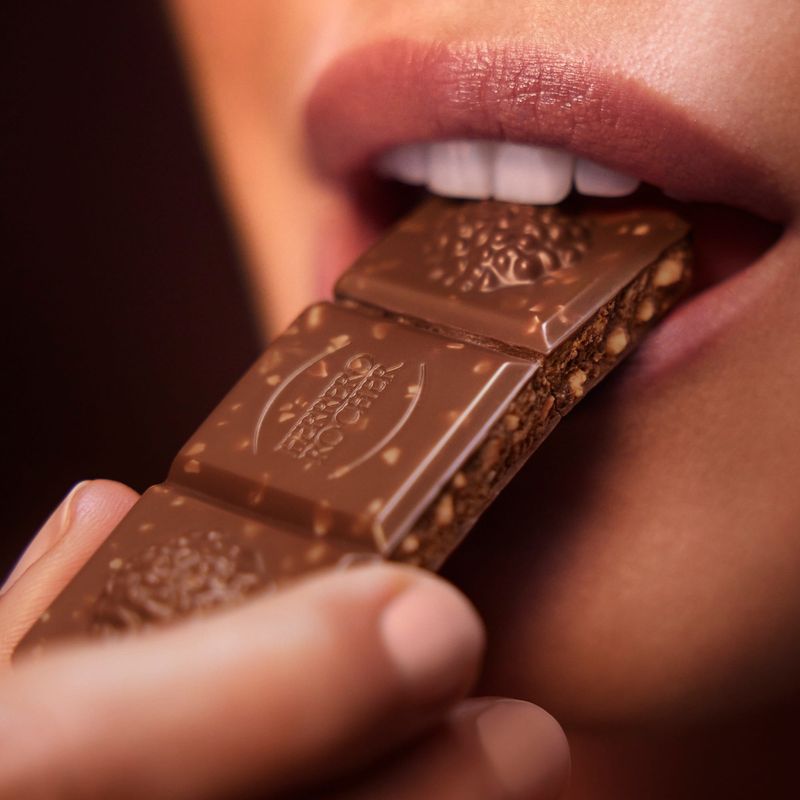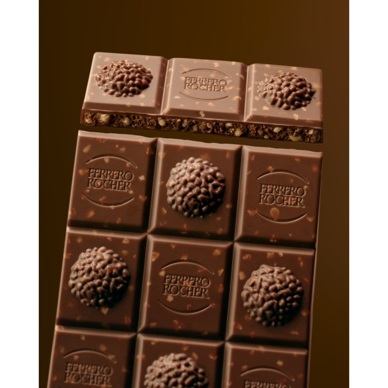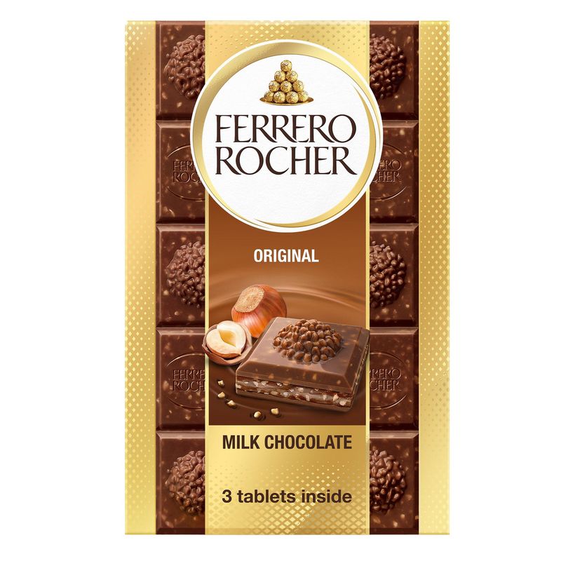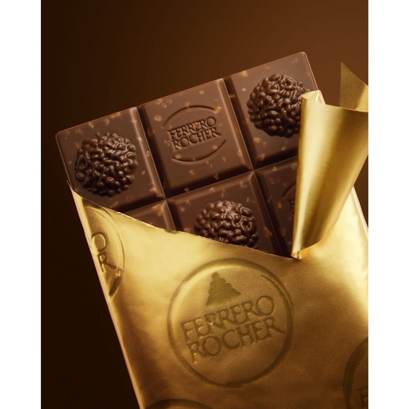 Ferrero Rocher Chocolates permite disfrutar de la experiencia única del sabor del emblemático praliné, un cuadrado cada vez. El objetivo del envase es recordar la forma del chocolate en un tamaño más grande mediante un acabado de primera calidad, colores gráficos específicos que indican claramente el sabor (leche, blanco, negro), sin dejar de recordar la imagen dorada de Rocher. El envase beneficia al consumidor al ser fácil de abrir, cerrar y reciclar. Cada bombón de 3,17 oz está singularmente envasado en una lámina de aluminio dorado que protege el producto y preserva el sabor y la frescura, recordando la preciosidad de la marca y evocando el envoltorio icónico del praliné.