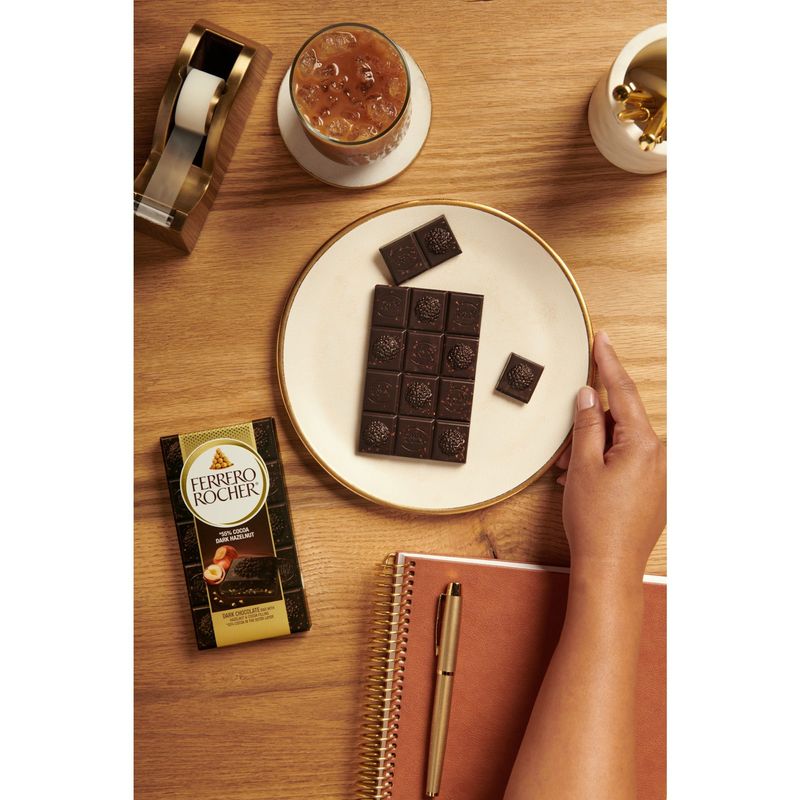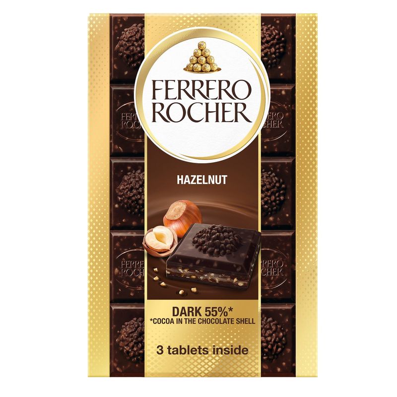 Ferrero Rocher Chocolates permite disfrutar de la experiencia única del sabor del emblemático praliné, un cuadrado cada vez. El objetivo del envase es recordar la forma del chocolate en un tamaño más grande mediante un acabado de primera calidad, colores gráficos específicos que indican claramente el sabor (leche, blanco, negro), sin dejar de recordar la imagen dorada de Rocher. El envase beneficia al consumidor al ser fácil de abrir, cerrar y reciclar. Cada bombón de 3,17 oz está singularmente envasado en una lámina de aluminio dorado que protege el producto y preserva el sabor y la frescura, recordando la preciosidad de la marca y evocando el envoltorio icónico del praliné.