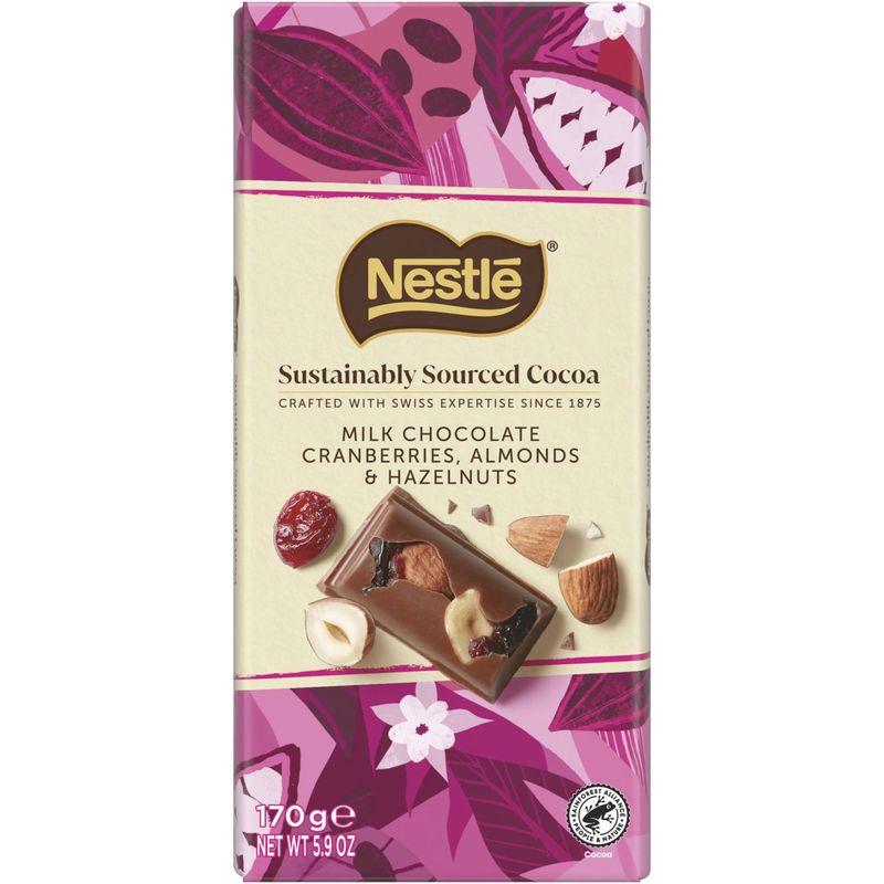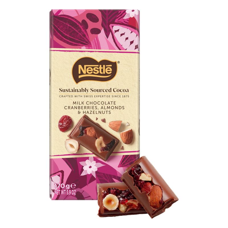 Discover mouthwatering decadence from NESTLE Sustainably Sourced Cocoa Milk Chocolate, Cranberries, Almonds & Hazelnuts Indulgent Tablet. A luxurious milk chocolate tablet with visible inclusions of cramberries, almonds and hazelnuts. Working with the Rainforest Alliance to support cocoa farmers and their communities. Crafted with Swiss expertise since 1875. Store in a cool, dry place at maximum 18°C to preserve the quality of the product. Experience the sensational taste of NESTLE Sustainably Sourced Cocoa Milk Chocolate, Cramberries, Almonds & Hazelnuts. A deliciously indulgent milk chocolate tablet crafted with visible inclusions of raisins, almonds and hazelnuts. At the heart of our creamy, smooth chocolate is sustainably sourced cocoa, so you can enjoy chocolate that does good* and tastes great. It's the perfect gift for taking home to chocolate connoisseurs, or for treating yourself on your journey.NESTLE has been working with the Rainforest Alliance to support cocoa farmers and their communities since 2009. - Exclusive to travel retail.