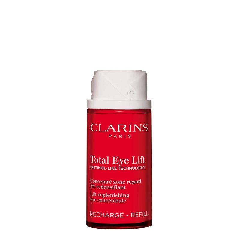 ¿Y si tuviera el poder de transformar sus ojos en sólo unos segundos? Esto es lo que promete Total Eye Lift y su efecto lifting en 30 segundos*. Una proeza tecnológica con una doble innovación en ciencia y fórmula. [TECNOLOGÍA RETINOL] - Un potente extracto de harungana bio tan eficaz como el retinol** y tan suave con el contorno de los ojos. Desarrollado por los Laboratorios Clarins, este activo patentado*** estimula la producción de colágeno x12. **** Se asocia a un nuevo extracto de jania roja de origen biotecnológico para un efecto lifting duradero en el contorno de los ojos. MATRIZ PRO-TIGHTENING - Este bálsamo confortable y cubriente forma una película reafirmante sobre la piel para un efecto lifting instantáneo. La eficacia de la textura está científicamente probada gracias a un nuevo protocolo de pruebas instrumentales de Clarins. Nueva versión rellenable.***** Asegúrate de guardar tu frasco de Total Eye Lift para poder rellenarlo más tarde. *Autoevaluación: 111 mujeres. **Estudio clínico comparativo realizado sobre la eficacia antiarrugas y alisante en 46 mujeres aplicando una fórmula que contenía extracto de harungana bio o retinol con el mismo % de ingrediente que el producto acabado, durante 56 días. ***Dos patentes Clarins registradas en Francia sobre la eficacia del extracto de harungana. ****Test in vitro sobre el extracto de harungana. *****El recambio no puede utilizarse solo.