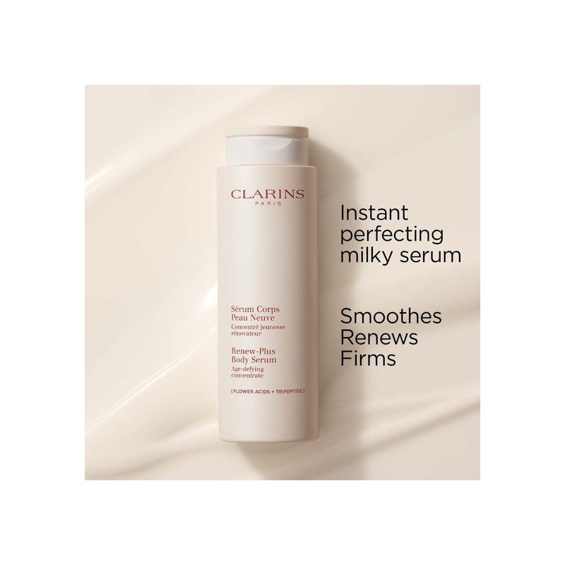 All the expertise of a Clarins face serum in a bodycare product. Its innovative, technical formula offers an instant skin-perfecting effect for stunning, smoothed and radiant skin. A duo of high-performance active ingredients : anti-ageing tripeptide helps to boost collagen and elastic fibre production to promote skin firmness and elasticity. It acts on the body’s youth markets : every day, creases are smoothed, skin is firmer and appears more toned. Hibiscus sabdariffa flower acids promote skin exfoliation , thanks to their AHA and pyruvic acid content of natural origin. Its smoothing serum texture brightens and smooths the skin. Floral, woody and musky scent.