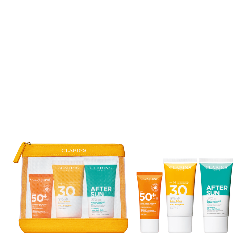 Viaja con CLARINS, tu Experto en Belleza. No te vayas sin tus básicos de verano que ofrecen protección de amplio espectro contra los rayos UVA/UVB: - Sunncare Face Cream SPF50+ que protege la piel del rostro de los daños causados por el sol y las manchas oscuras - Suncare Body Cream SPF30 que protege el cuerpo para revelar el bronceado más bonito - Aftersun Balm que hidrata y calma la piel después de la exposición al sol Todo el set se presenta en un kit de diseño ecológico. Y ahora, ¡a brillar! Este set contiene: 1x Suncare Crema Facial SPF50+ 30ml 1x Suncare Crema Corporal SPF30 75ml 1x Suncare Bálsamo Aftersun 75ml