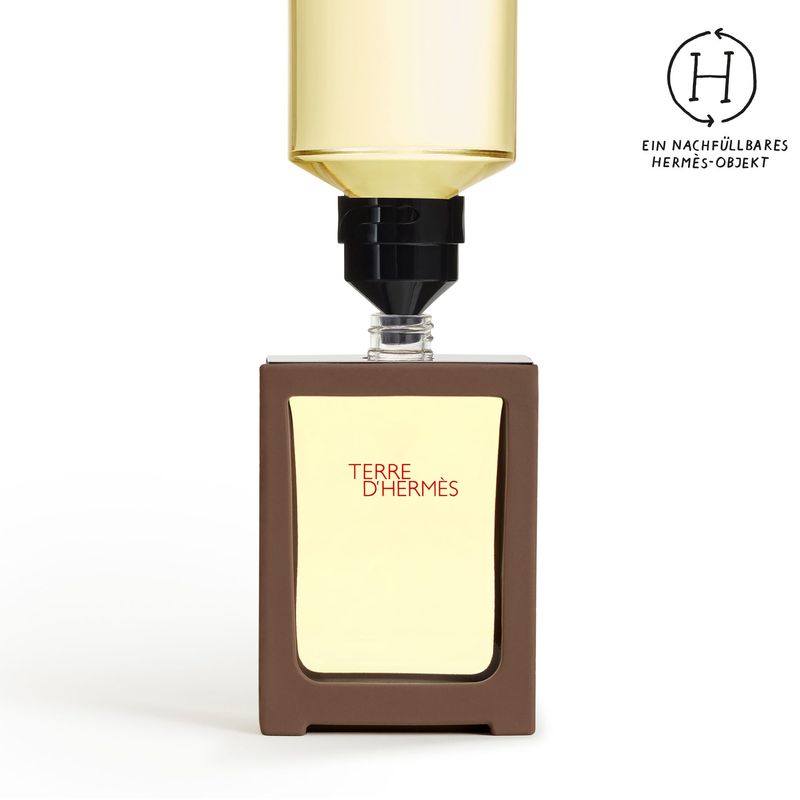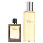 Un estuche compuesto de un vaporizador de viaje Terre d'Hermès Eau de Toilette de 30 ml, enfundado en una cubierta de resina ligera y antigolpes, y de una recarga de 125 ml. El vigor de los cítricos y las pimientas, unido a la nota del sílex marcan una huella en la tierra. Terre d’Hermès habla de la relación del hombre con la tierra, su diálogo humilde y armonioso con la naturaleza y los elementos. Terre d’Hermès es el perfume que vincula al hombre con sus orígenes, con la fuente de su poder de creación.