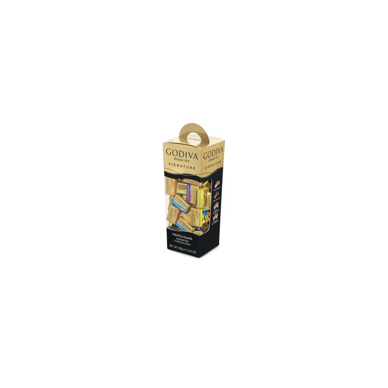 GODIVA SIGNATURE NAPOLITAINS 450 GRDescubra los populares Napolitains de GODIVA en elegantes envoltorios de autor. En su interior le espera la perfección del chocolate puro GODIVA en cuatro sabores: chocolate con leche, chocolate negro, avellana con leche y pistacho con leche. Se presentan en una práctica caja de regalo en forma de torre para que pueda llevar su GODIVA a todas partes.