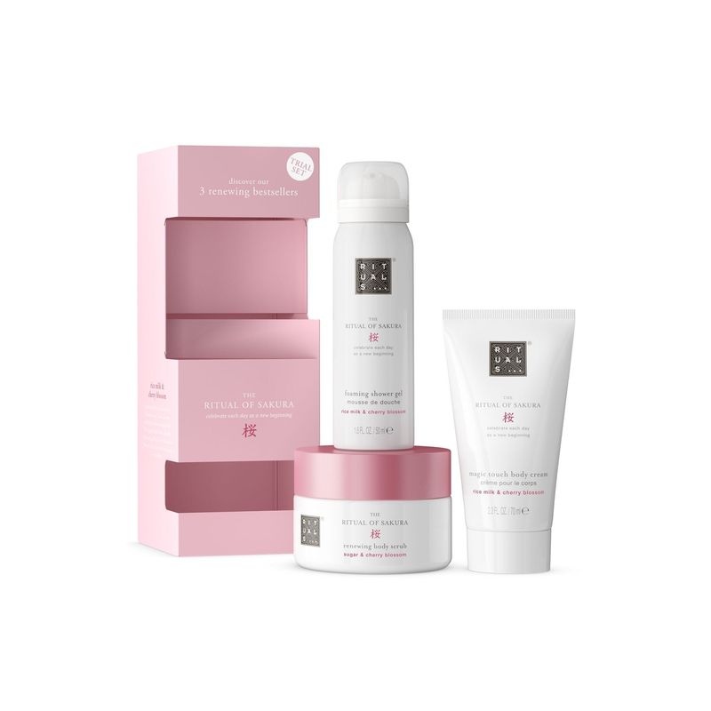 The Ritual of Sakura set is the perfect introduction to Rituals and makes an ideal gift for your loved ones or yourself, combining three of the collection's bestsellers: a shower foam, 92% natural-origin body cream and a 91% natural-origin sugar polish scrub. All enriched with the renewing scent of cherry blossom and nourishing rice milk extract.