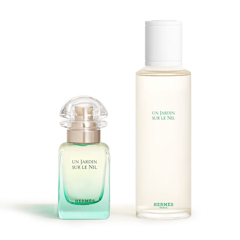 LA CREACIÓN El Eau de toilette Un Jardin sur le Nil, creado en 2005, evoca un viaje olfativo a las «islas-jardín» de Asuán, en Egipto. Con esta composición, el perfumista Jean-Claude Ellena capta la esencia del río que le da nombre, sinónimo de vida y generosidad. LAS NOTAS OLFATIVAS El Eau de toilette Un Jardin sur le Nil, verde y amaderado, asocia un mango verde acidulado con un loto delicado y un sicomoro elegante. EL OBJETO El frasco, diseñado por Fred Rawyler, se inspira en las líneas de los faros de los coches de antaño. El vidrio del frasco cobra vida gracias a un delicado degradado verde inspirado en la ribera del Nilo. El estuche está ilustrado con una flor de loto dibujada por el pincel de la artista Véronique de Mareuil. LA ÉTICA El vaporizador de viaje Un Jardin sur le Nil Eau de toilette de 30 ml se presenta acompañado de una recarga de 125 ml. Un gesto responsable, indisociable de un objeto concebido para perdurar. LA COLECCIÓN PARFUMS-JARDINS La colección de los Parfums-Jardins constituye el punto de encuentro entre la esencia de un lugar, la fuente de inspiración del perfumista y el tema que escoge la maison Hermès cada año para ilustrar su creación. Un recorrido olfativo que invita a disfrutar de cada momento compartido y a perseguir el deseo de frescor, de soñar y de evadirse.